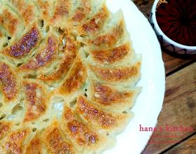- 4. 热锅后放1.5大匙油,熄火,将煎饺排入锅中后再开中火煎到底皮略为上色.(这边是很淡很淡的上色就可以了)