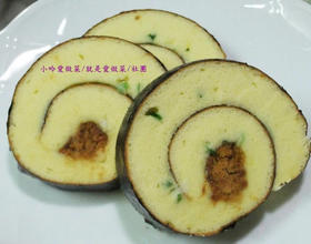 - 12. 蛋糕体舖上沙拉酱→刚刚划3刀的上方舖上肉松