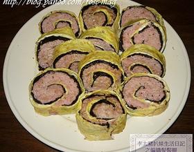 - 3. 将蛋皮由一边卷至另外一边,开口处压在碟上。烧滚一镬水后,将肉卷放入镬中蒸12至15分钟,以一腐竹籤或刀尖轻插,如果容易插入,抽出时又没有生肉黏附就可以收火。