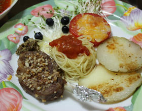 先热锅后,以大火将小羊排两面略为煎熟,再与马铃薯,洒上起司粉的番茄,淋上些许橄榄油,一同放入烤箱.(温度与时间,视烤箱状况与个人喜好调整.)