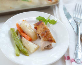 热少许油,摆入鸡腿,用中火,两面各煎2分钟成微黄色;蔬菜铺进烤盘,摆上鸡腿;将烤盘送进预热好180度烤箱,中层,上下火,烤15分钟,取出,撒上薄荷叶装饰就做好了。