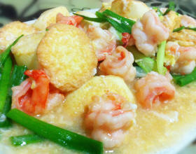 - 1. 预备食材,将玉子豆腐切粒然后下锅油炸至金黄色,然后盛起,将处理好的鲜虾也下锅油炸20秒左右盛起待用。