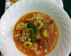 - 6. 炒洋葱、红萝卜。再放入高丽菜、小番茄和香菇。加入番茄汁意式香料,煮滚。最后加入豌豆和面疙瘩。稍煮一下即可。