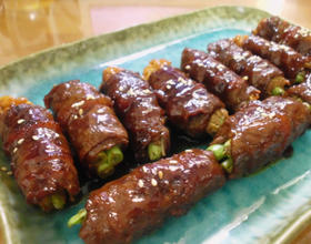 四季豆或其他蔬菜川烫并切段备用  - 2. 将肉片摊开 取适量金针菇及四季豆