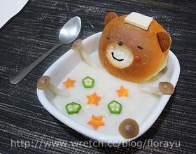 - 1. 【制作面包熊】 1-1.餐包用小刀在中下方画一圈、切除。 1-2.切除的面包切半当耳朵 1-3.餐包上方划一刀好让耳朵能镶入 1-4.用剪刀剪出眼睛、鼻子和嘴巴用沙拉酱黏贴好