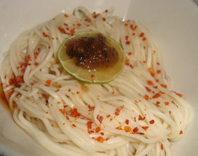 步骤5取一深碗,夹入关庙面,加入高汤,可依个人喜好加上柠檬切片、