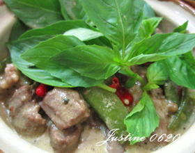 盛成品盘后堆置九层塔叶于绿咖哩牛肉上,食用时拌入九层塔叶即可