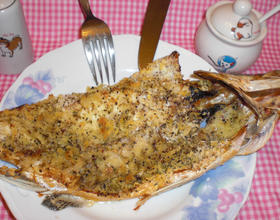 鲈鱼切开摊平,将起司粉.意式香料.大蒜.盐.黑胡椒.在碗中拌匀, 撒鱼肉上,上面再放上奶油块.淋上橄榄油.进烤箱35分,边烤边淋上白酒, 烤好即可食用