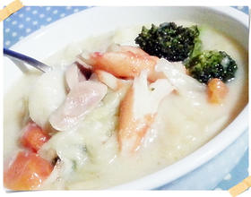 加入绿花椰菜.海鲜.牛奶煮5分钟