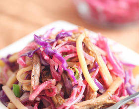 放入紫甘蓝,心里美萝卜翻炒,用少许热高汤淋入