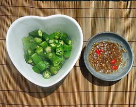 将秋葵洗干净,在大滚中煮约5分钟,盛起待凉。