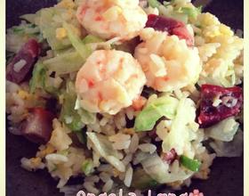 再加入虾仁和叉烧,炒至虾仁半熟,需时约2-3分钟。备用 - 2. 在相同的锅内再加入米饭,炒至米饭粒粒分明之后加入鸡蛋,炒到鸡蛋凝固,需时约2分钟。将虾仁和叉烧加入,并加入莴笋和葱,炒至全部熟透,加盐调味后起锅。