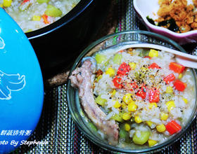 宾仔骨川烫过后加进泡软的白米和水,地瓜,红萝卜和玉米粒和玉米粒汤汁熬煮成粥~完成后再加进自制调味粉和盐,酱油拌匀~吃得时候撒上适量的海苔粉,蒜粒粉,黑胡椒粒即可完成丰富营养的粥品!