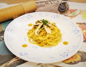 接着放入南瓜泥、橄榄油、高汤搅拌均匀并转中火煮滚(持续搅拌避免黏锅),以3小匙盐、黑胡椒粉与欧芹末调味与增香,完成酱汁;另取汤锅放入适量的水煮滚并放入1小匙盐,接着放入意大利面,煮软后捞出沥干并拌入少许的橄榄油,将面条盛盘淋上(或拌入)酱汁,最后撒上欧芹末即可上桌。