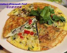 2) 取煎锅, 热油炒香蔬菜类, 转中火, 倒入蛋液, 表面洒上甘松, 盖上锅盖, 烘3-5分钟