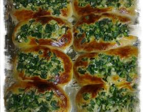 将葱洗净沥干水分切为小葱花,拌入C馅料(鸡蛋这时还不能放喔)备用. - 4. 等面包膨胀到2倍大,拿出分成8等份整型,桌面洒一点干粉以防沾黏,将面团擀平铺开放入火腿丁卷起后整形放上烤盘,微波烤箱内用喷枪喷点雾气,面包表面也喷点雾水,设定烘焙发酵40度40分钟 做第2次发酵