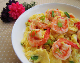 - 5. 原油锅倒入食用油1大匙,葱白后转中小火倒入蛋液用筷子由外向内划圈(为了不让蛋煎太熟),再放入作法4的虾仁拌炒至蛋液有凝固状即可熄火,洒上葱绿再拌炒数下,就完成啰~