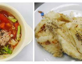 (炒完蔬菜煎薯饼) 将薯泥捏成圆饼状 在表面加入丝状马铃薯 增加不同口感 煎至表面金黄即可 - 4. 依序将蔬菜、番茄汁及肉丸 进电锅蒸熟