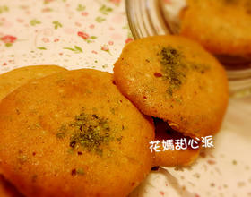 当拌好的材料放上烤盘在表面再洒些海苔粉 入烤箱上火160下火150~烤约15分即可