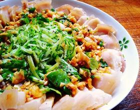 4) 蒸好后的带皮五花肉切成适当的厚薄度,如照片围圆盘一圈