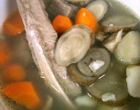 牛蒡切片立即入另一冷水锅再煮沸较不易变黑,煮沸后连汤加入红萝卜马铃薯排骨那锅