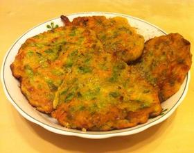 芹菜叶洗干净切成细末,加一颗蛋、面粉、糖、盐、水(依自己喜爱调浓稠度)