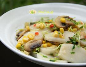 蘑菇厚切成片(3~4mm),配料切成适当大小准备好。