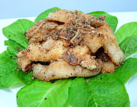 油清出,同锅放炸好的鱼片、蒜片、花椒和盐少许,中火轻轻拌匀,盛盘洒上黑胡椒粒。