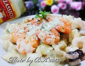- 7. 煮到酱汁略收,加入调味料拌匀就完成了超级美味的「白酱海鲜贝壳面」啰!