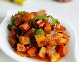 切好的藕丁在开水里淖一下,捞出沥干水分。
