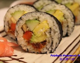 ** 不会沾手的内馅材料如: 小黄瓜, 红萝卜, 芦笋, 蛋皮, 虾仁...之类 - 6. 最后将寿司边压边卷起即完成寿司卷. 食用前再将寿司卷切片成适当大小即可