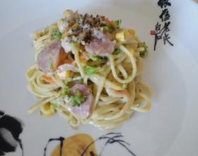 - 3. 另起锅将鲜奶 ,切好的香肠片,花椰菜花,玉米粒放入锅中后开小火,煮的当中要一边搅拌,煮到较慢熟的香肠煮熟后 ,在将起司条放入持续搅拌到起司条溶化后关火,加入少许盐(依个人口味噌减),最后将荞麦面倒入锅中拌匀即可,陈入盘中撒上少许黑胡椒粒完成~