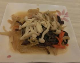 备好食材,榨菜、红萝卜及木耳切丝,美白菇去蒂
