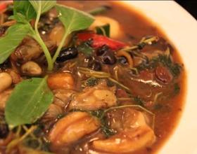 接着放入得意的一天香菇素蚝油、米酒,再把牡犡(蚵仔)和青葱到入锅中炒,即可盛盘!最后再放入一根九层塔即可完成。