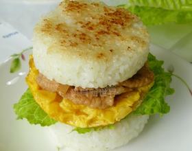 - 6. 取一个米片~依序放上生菜.煎蛋.照烧肉片~最上面再放另一个米片~~~完成啰