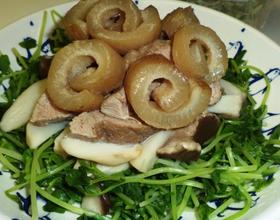 汆烫碗豆苗摆盘,依序放上放入肉骨茶汤中煮熟切片的杏鲍菇,松坂肉,猪皮
