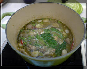 - 4. 加入茄子、四季豆、青豆仁、糖和鱼露,开大火煮滚后,转小火煮至茄子变软,起锅前加入九层塔即可