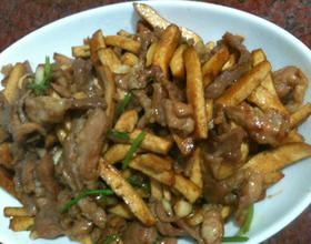 热锅冷油炒肉丝至香味出来后加入蒜头, 翻炒后沥油先捞起