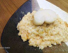 - 2. 热锅加入奶油,奶油溶化后把洗过的白米到入搅拌均匀,直到奶油散出香气。