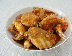 蟹肚剪成两半,将切口朝下,放在油中略煎(蟹肉很嫩,这一步是为了让蟹肉不散出来);