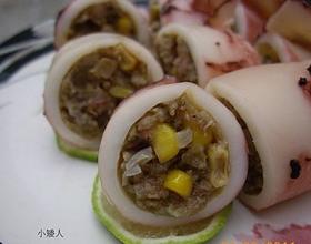 将步骤 (1)用小汤匙塞入墨鱼内 , 封口处用牙籤固定住