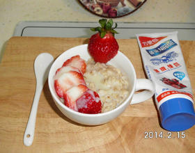 草莓切片装饰,再挤上香香甜甜的鹰牌炼奶