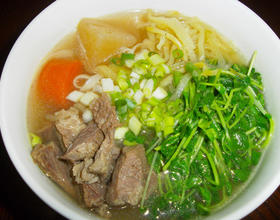 牛肉汤(里有肉块.萝卜.胡萝卜块)煮沸后加点白胡椒粉,再调整一下咸味,