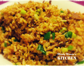 隔夜饭在油锅里要稍微用力压平,制造锅巴有点微焦的口感(将水分收干);如果手力还可也可在起锅前,稍微用手腕力气稍微甩锅,将空气拌入饭中,制造粒粒分明的蓬松感!这就是独门密传的黄金牛炒饭!