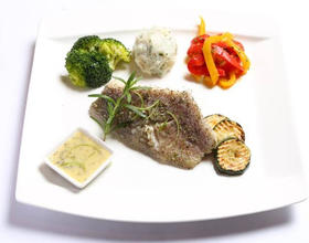 川烫的新鲜鱼汁加入柠檬汁收干作为酱料淋上,搭配香草、马铃薯泥、烤节瓜、烩甜椒