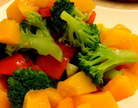 另外拿一大沙拉碗,放入番茄及花椰菜,加入调味料拌匀.