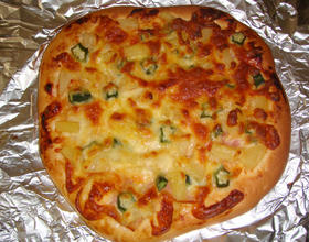 在圆片上用叉子叉些小洞后,先涂上一层番茄酱,依序舖上凤梨片、番茄片、培根、秋葵,最后舖一层起司丝,即可放入已预热至170度的烤箱中烤约15分钟,饼皮金黄即可。