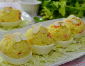 使用挖球器或汤匙整成圆型状放在蛋白上,洒上杏仁片装饰完成。