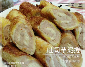 (3)用捣泥器捣成芋泥并搅拌均匀后备用。 - 2. 将吐司切边,用擀面棍压边(勿压得太紧实,以免吐司卷起时易裂开)。
