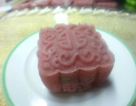 时间到,取出冰过面团,各分成9 g/个共34个,并且把两种颜色面团分开压平,擀平、中间小厚,边边薄薄,就如擀饺子皮;取备好的蔓越莓豆沙放在面皮中间,用拇指由外往内压入,捏紧、入模、成型;